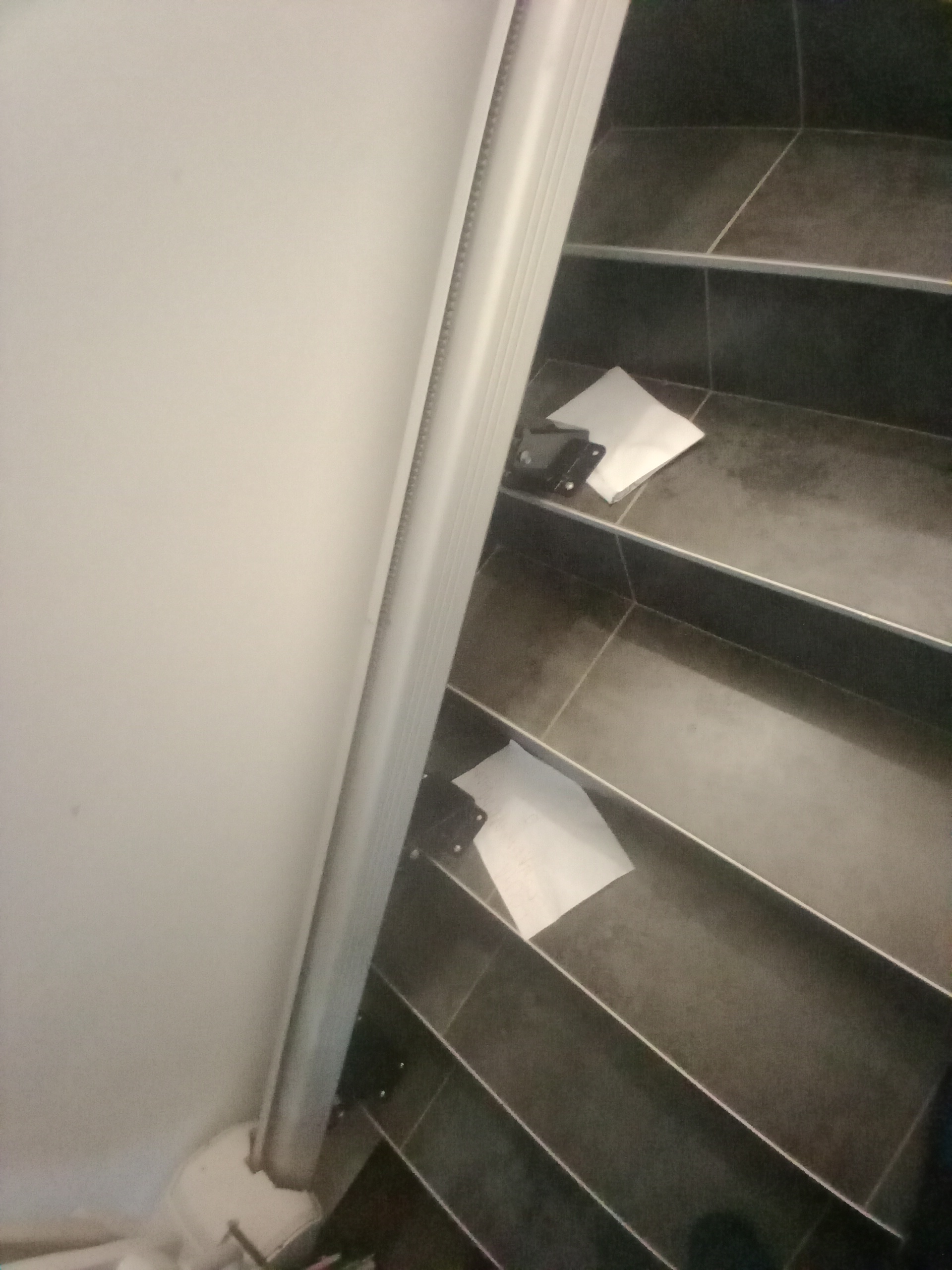 Installation d'un monte escalier pour personne handicapée bâclée (voir photos)2 vis a la place de 4 .., suite au refus de régler le solde , huissier et compagnie , entreprise a fuir , la sécurité n'y est pas .